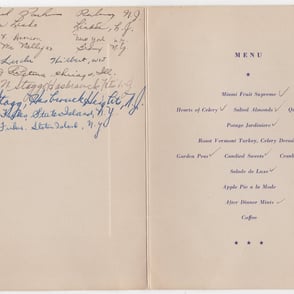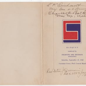 A banquet menu with signatures from the Fighting 69th Division Association Reunion banquet. Signatures include those of Major General Emil F. Reinhardt and General Charles L. Bolte, commanders of the 69th Infantry Division.