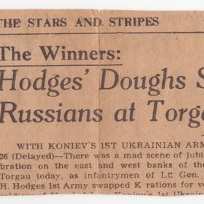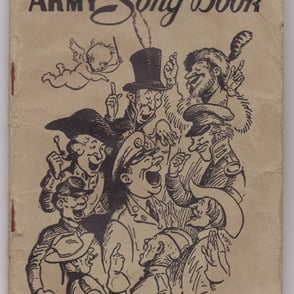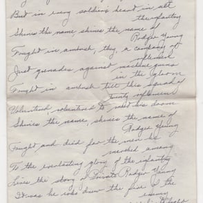 An army-issued songbook filled with 67 songs. To learn more about the songbook, click here. Folded inside the army book were handwritten lyrics of "The Ballad of Rodger Young," an American war song written by Frank Loesser in March of 1945. To listen to the song, click here.