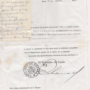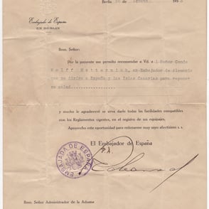 "I hereby recommend to you Count Wolff Metternich, former German ambassador, who is traveling to Spain and the Canary Islands to recover his health. I would be very grateful if you would provide him with all the facilities compatible with current regulations for the registration of his luggage. I take this opportunity to reiterate my sincere regards." Signed by the Ambassador of Spain in Berlin, Germany, on August 22, 1933.