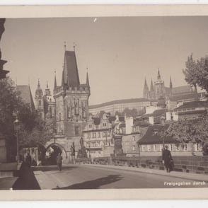 Die herzlichsten Grüße aus dem schönen Prag sendet Euch allen Walter. Prag ist die schönste Stadt, die ich bis jetzt gese-hen habe, sie gehört ja auch mit zu den fünf schönsten Städten der Erde. Im Hintergrund rechts ist die Burg, es war das erste Bild aus dem Buntfilm "die goldene Stadt". In Wien bin ich auch gewesen, ich war enttäuscht, auch der Prater ist nur ein großes Schützen-fest. Die Parkanlagen sind aber dort gut.