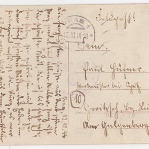 A postcard, sent from Prague to Leipzig, written in German Kurrent script. Transcription and translation is as follows: